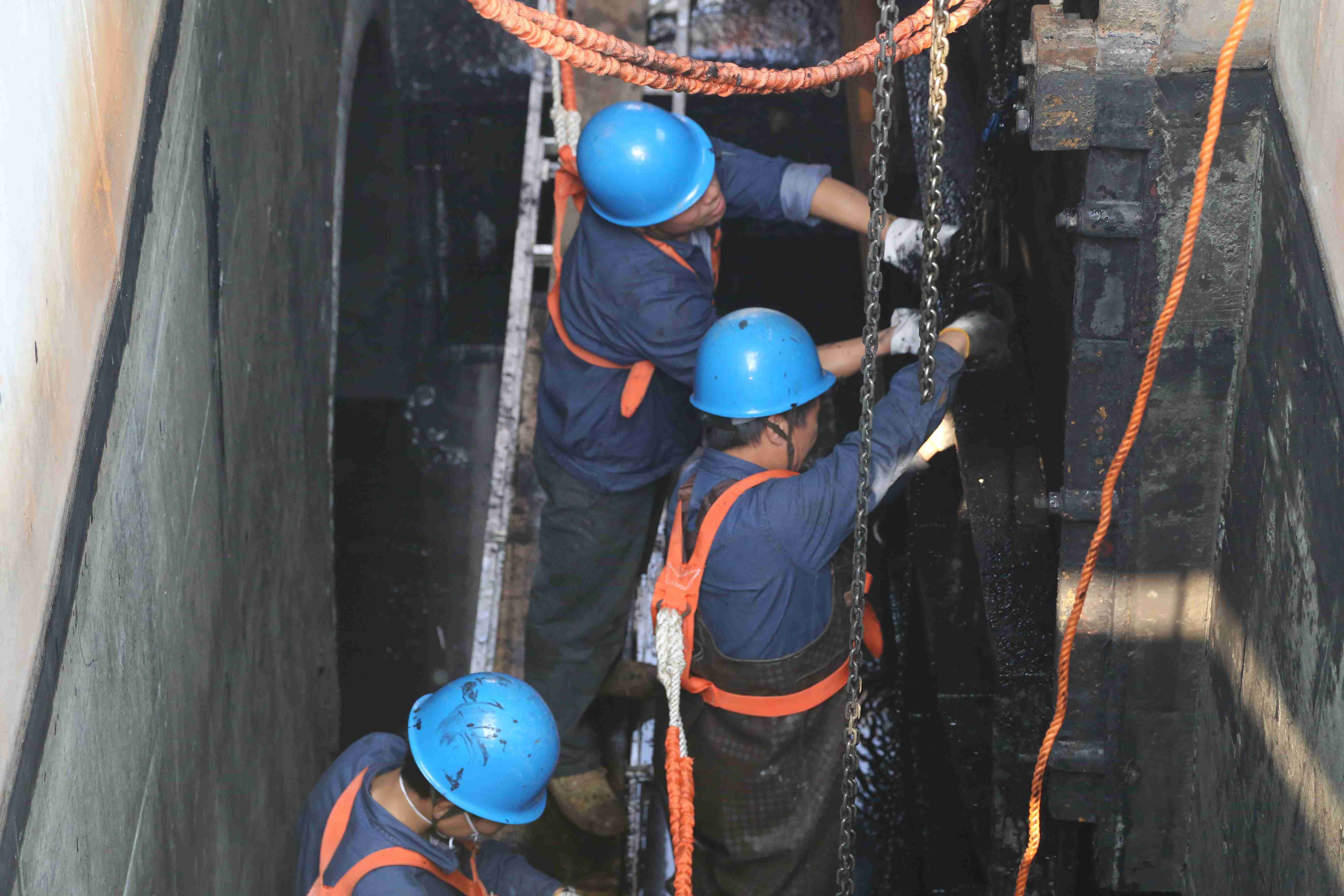 本次維修工作從抽水沖洗、池底通風到恢復進水,歷時12小時,公司維修人員在池底連續工作超過7個小時,面對池底有限空間內環境惡劣及工作強度大等諸多困難迎難而上,充分體現了江濱人對工作的責任心與積極性。
